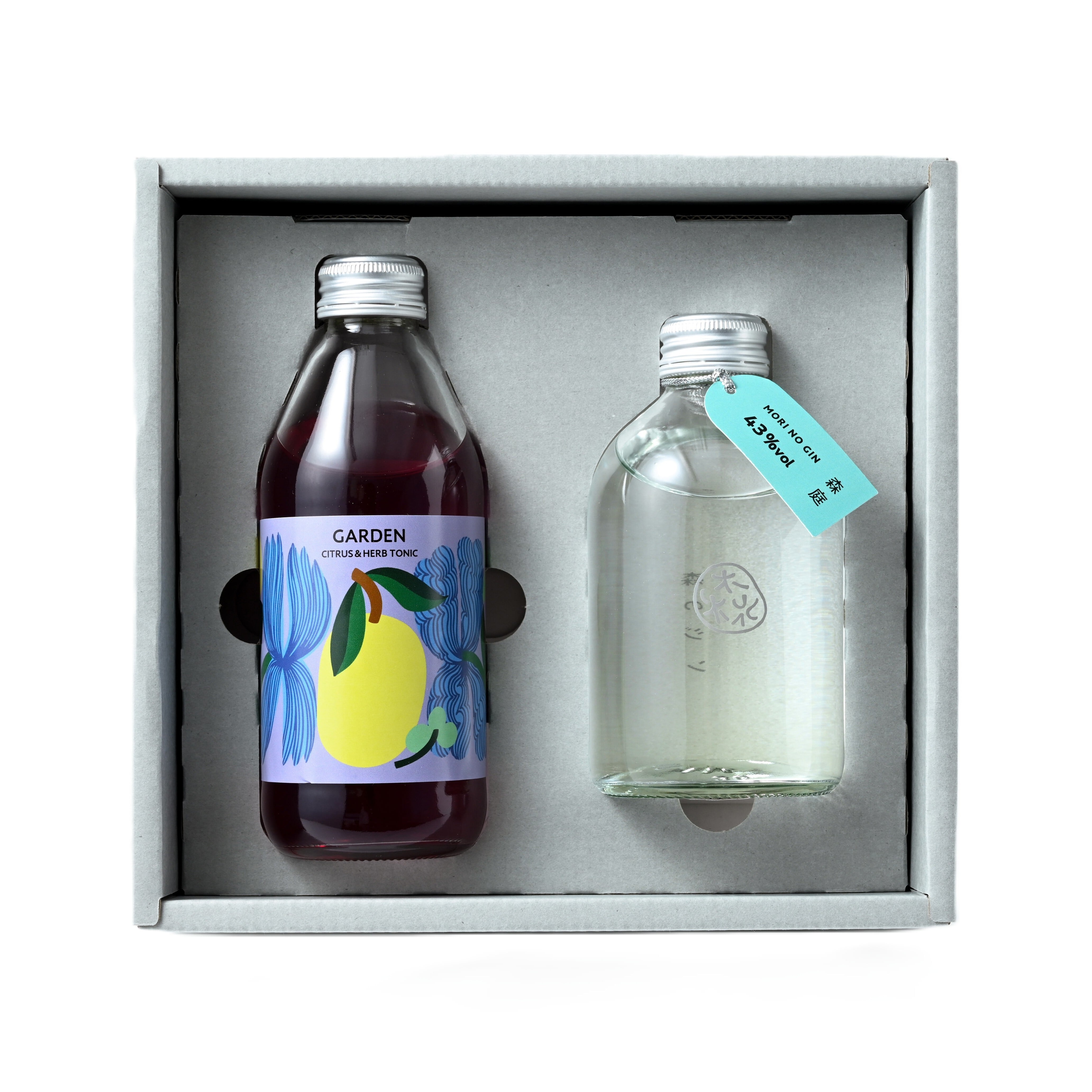 このギフトセットでは、MORI NO NIWAの代表作である「森のジン 森庭(Alc.43%)と、自家製シトラスウォーターを使ったクラフトトニック(炭酸飲料)を詰め合わせました。